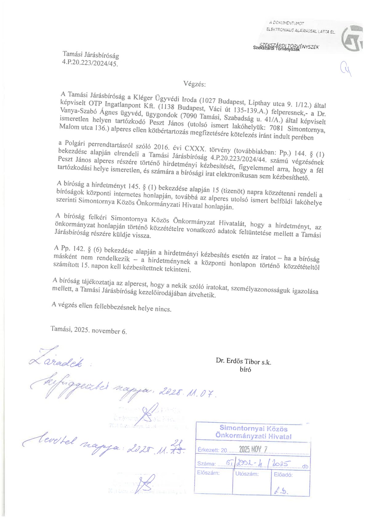 Hirdetény kifüggesztése a Tamási Járásbíróság végzéséről:
