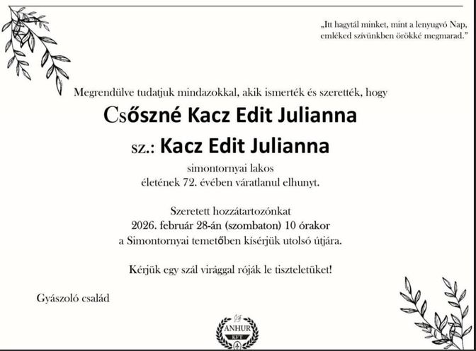 Mély fájdalommal tudatjuk, hogy 2026. február 12-én hosszantartó betegség után meghalt Csőszné Kacz Edit Simontornya Város korábbi polgármestere, aki 17 éven át vezette településünket.