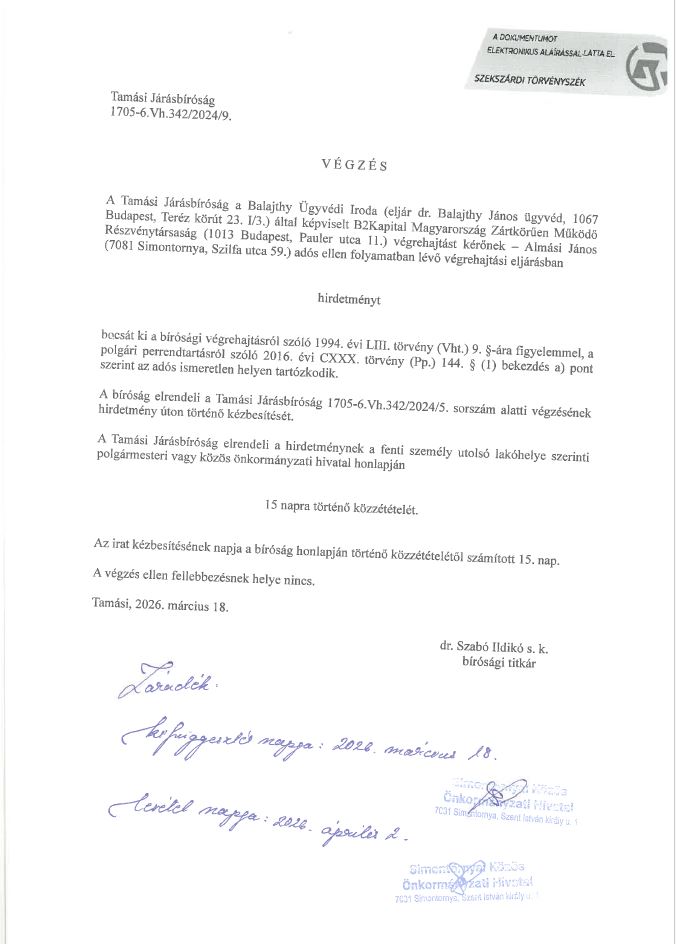 Hirdetény kifüggesztése a Tamási Járásbíróság 1706-6 Vh342/2024/9. számú végzéséről: