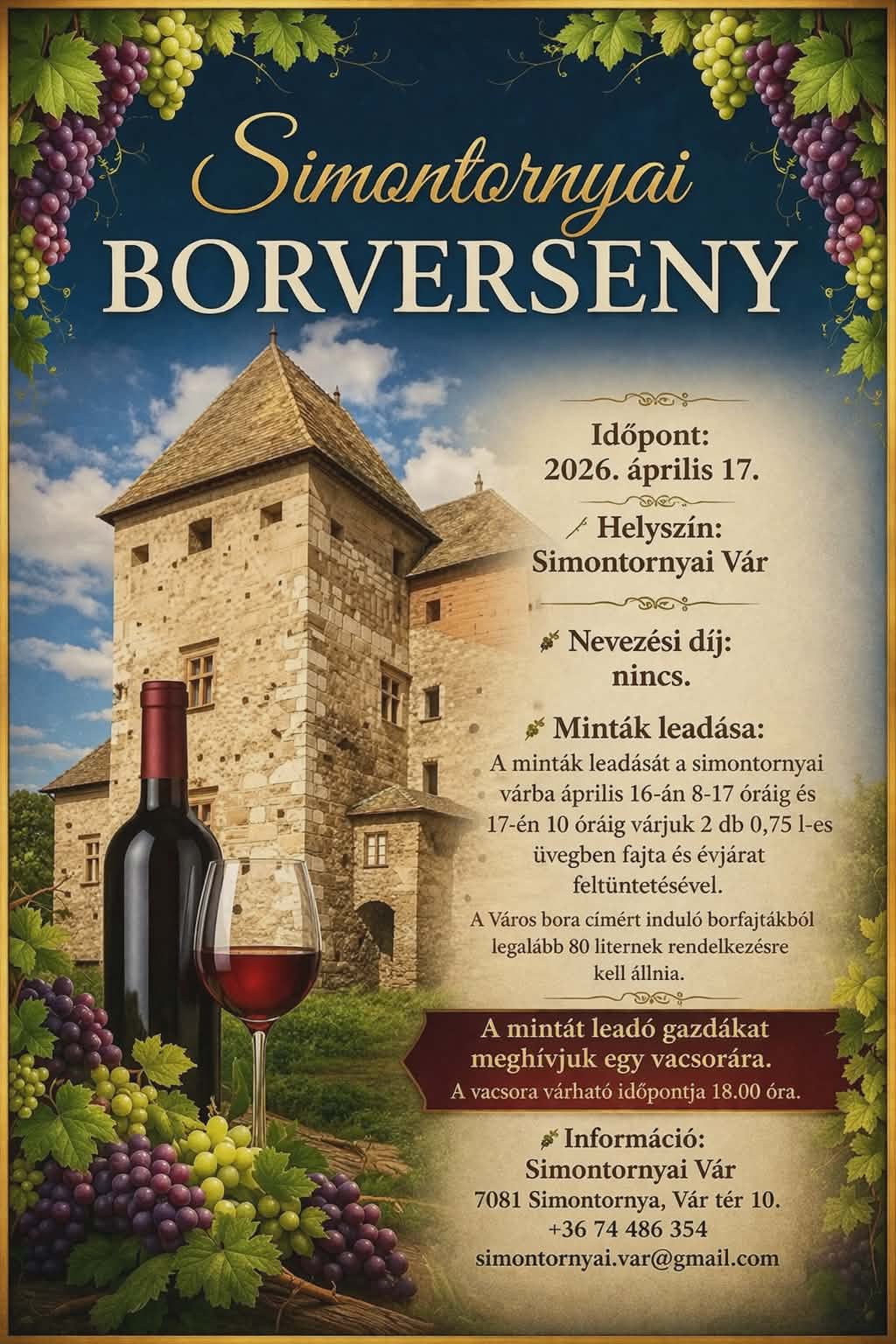 Ezúton tisztelettel meghívjuk Simontornya Város Önkormányzata és a Simontornya Múltjáért Alapítvány által szervezett regionális borversenyére, amely 2026. április 17-én, pénteken a Simontornyai Várban kerül megrendezésre.